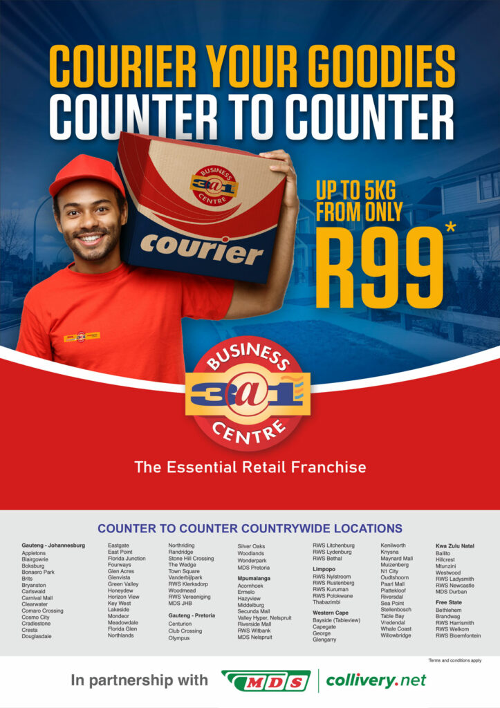 Send documents and packages from as little as R99.00 Counter-to-Counter within South Africa. Prices depend on the size (length & width & height) and the weight of your parcel, its final destination and the time sensitivity of delivery. T&C’s apply and incorrect information provided for the shipment may result in delays and added costs to be charged. Ask us for a free quote.